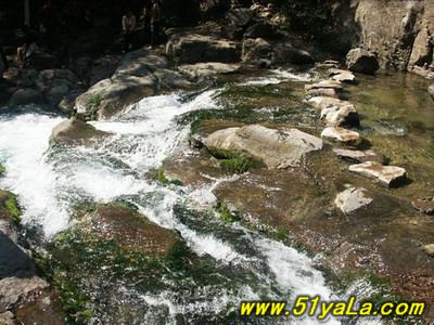 過了洗臉盆便是水簾洞。一股兩米寬的泉水從北峽溝的洞中涌出,緩流四五十米后順山崖直壁而下,一派“飛流直下三千尺”的磅礴氣勢。其后一深洞,嘩嘩瀑布落就半崖伸出的青石板上,打著飛快的漩渦卷人洞內(nèi),而后又從洞底端漏口處噴出,驚濤駭浪之聲震山蕩谷。泉水正是莽河之源。這個洞叫“出水洞”,一年四季泉水奔流不息。泉水流經(jīng)之處,有一個懸崖,形成瀑布,這就是莽河著名的風景區(qū)“水簾洞”,因為懸崖中間有個洞,像是在瀑布中間有個巨莽的腦袋,蟒口大張,吸水噴霧,戲耍流泉。另有一塊巨石,像是一只烏龜從甲殼底下探出了頭,似乎在祈求幫助。嘩嘩瀑布落就半崖伸出的青石板上,打著飛快的漩渦卷人洞內(nèi),而后又從洞底端漏口處噴出,驚濤駭浪之聲震山蕩谷。