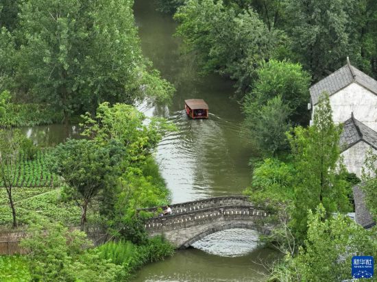 7月11日,游人乘船游覽穆溝古村(無人機照片)。