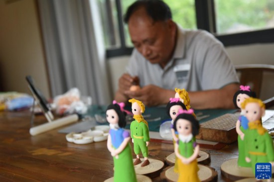 7月11日,江蘇省級非物質文化遺產“阜寧面塑”傳承人周必良在穆溝古村進行創(chuàng)作。