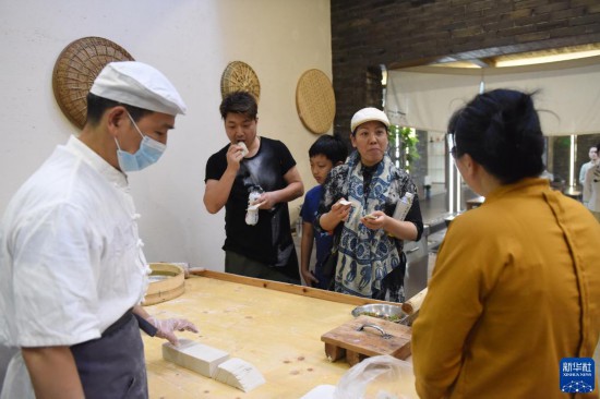 7月11日,游客在穆溝古村品嘗特產“阜寧大糕”。