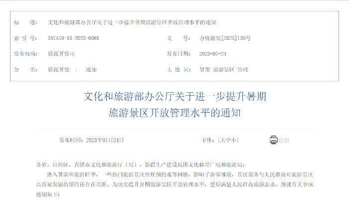 近日,文化和旅游部網(wǎng)站發(fā)布“關(guān)于進一步提升暑期旅游景區(qū)開放管理水平的通知”,從優(yōu)化預約管理、強化彈性供給、推動產(chǎn)品創(chuàng)新、提升服務(wù)質(zhì)量、實施錯峰調(diào)控、規(guī)范市場秩序、嚴守安全底線、強化宣傳引導八方面作出部署。