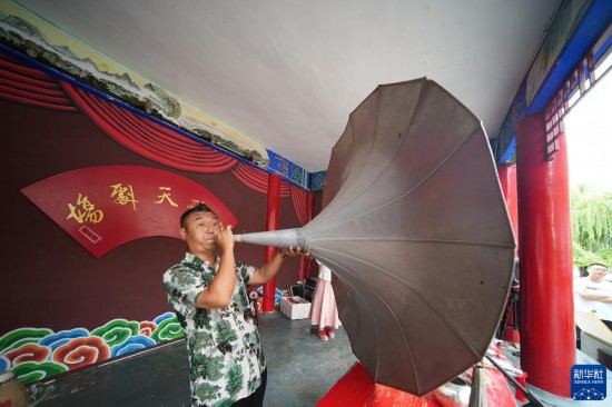 8月12日,在河北省滄州市吳橋雜技大世界景區(qū)江湖文化城吹破天劇場,雜技藝人表演吹嗩吶。