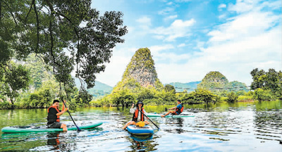近年來,廣西壯族自治區(qū)桂林市利用得天獨(dú)厚的自然條件推動旅游和體育融合發(fā)展,日益展現(xiàn)出“戶外運(yùn)動天堂”的魅力,吸引著中外游客和運(yùn)動愛好者。如今在桂林,人們不僅可以觀賞山水美景,還可以體驗(yàn)攀巖、溯溪、槳板、探洞、自行車、滑翔傘等多種多樣的戶外運(yùn)動。圖為游客在桂林市陽朔縣劃槳板。(新華社記者 胡星宇/攝)
