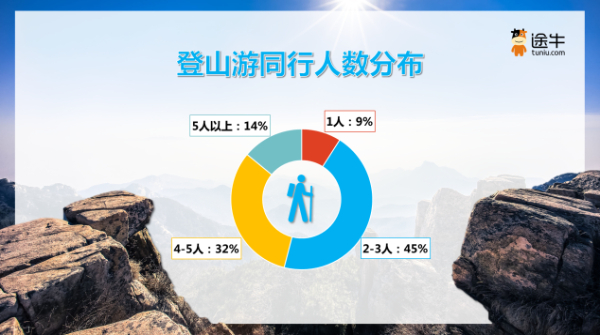 相比其他旅游項目,登山游對用戶的體力和意志力都是較大的挑戰(zhàn),因此,大多數(shù)登山游用戶會選擇多人結(jié)伴同行,以便于登山途中互相鼓勵、互相協(xié)助。《報告》顯示,2-3人或4-5人同行是更多登山游用戶的選擇,出游人次占比分別為45%和32%。
