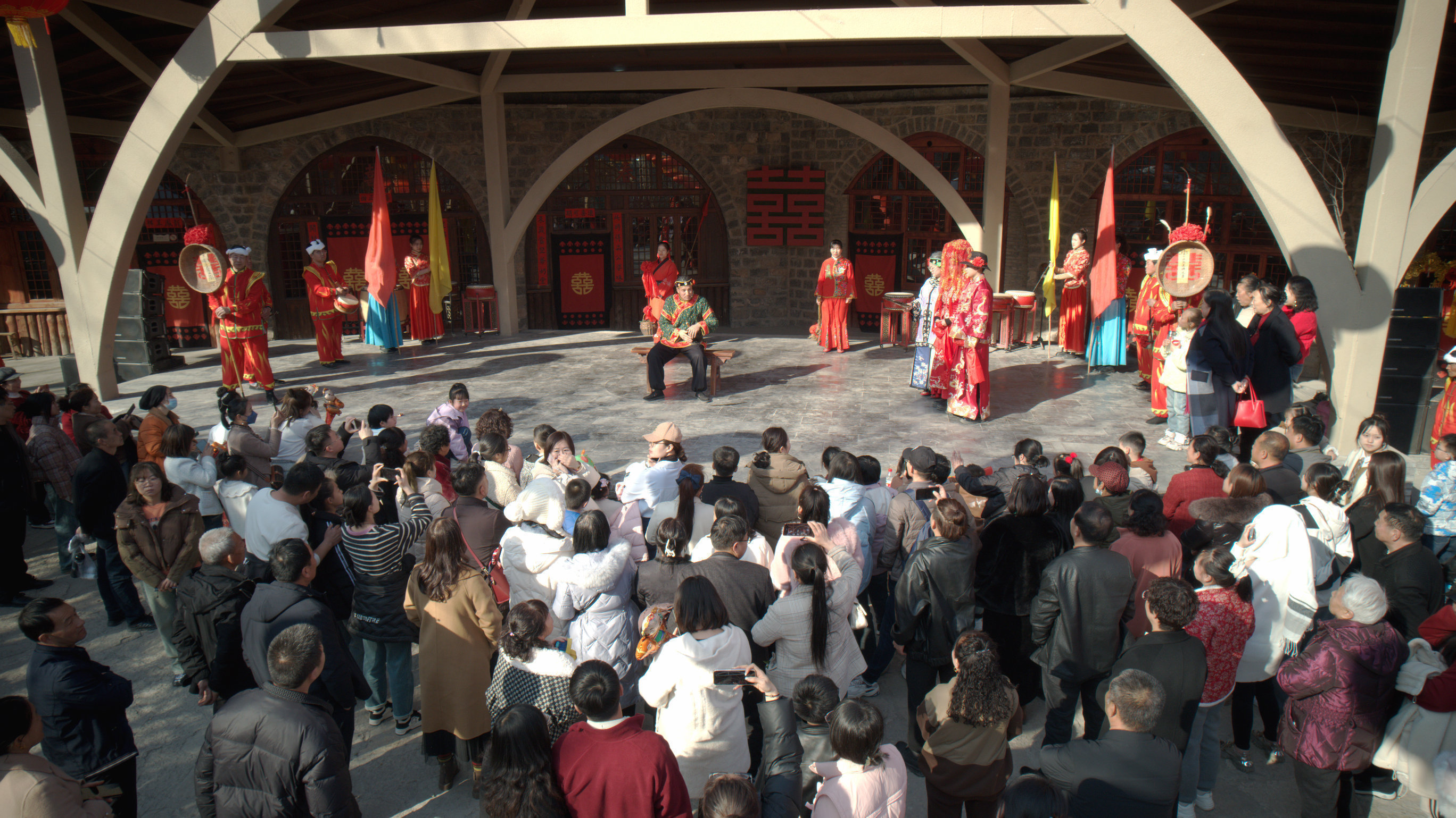 紅火的燈籠、喜慶的中國節(jié)、鮮艷的“樹掛”扮靚了塔爾坡古村,年味濃濃,喜氣洋洋。喜慶嗩吶,大紅花轎,在“婚俗院”可近距離感受傳統(tǒng)婚俗文化。“新郎”“新娘”換碗吃面、“婆婆”抱鹽罐等婚俗情景表演,讓人忍俊不禁、歡笑不斷。“野鵲子喳,喳梅花,梅花坡哩人蒞啦……”本土歌手原汁原味的鄉(xiāng)寧民歌,博得陣陣掌聲和喝彩。