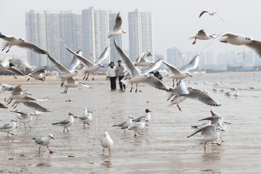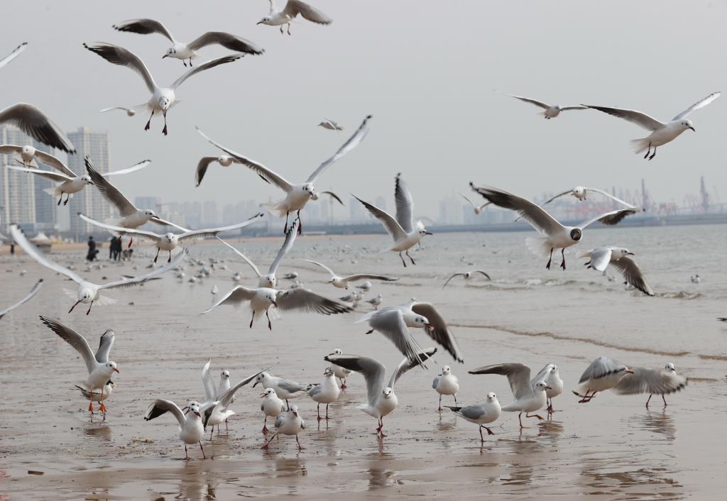春日和暖,大批海鷗在河北省秦皇島市金夢(mèng)海灣浴場(chǎng)飛舞、覓食,吸引游客前來(lái)觀賞。