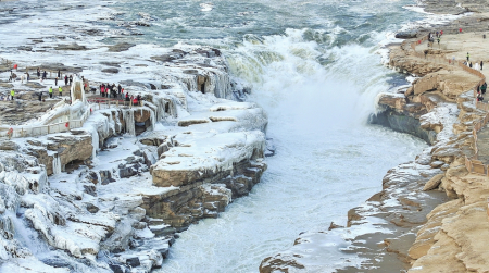 1月11日,人們在吉縣黃河壺口瀑布拍照游玩。連日來,受冷空氣影響,吉縣黃河壺口瀑布形成壯美“冰瀑”景觀,吸引大量游客前來賞景。