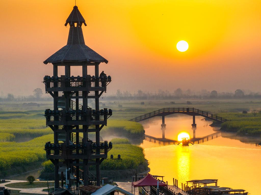 ??2025年4月8日拍攝的江蘇省興化市千垛景區(qū)日出晨景(無人機(jī)照片)。新華社發(fā)(周社根 攝) 蜻蜓點(diǎn)水 蛙鳴蟬噪 靈動(dòng)的“水鄉(xiāng)交響” 讓或騎行或漫步的游客沉醉不已 盛夏時(shí)的暑氣 消解在里下河國(guó)家濕地公園的萬畝荷塘中