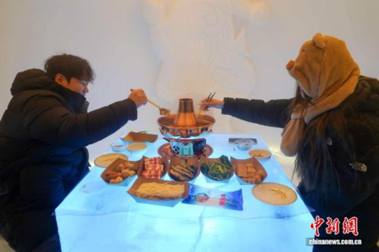 在用雪打造的屋子里,羊肉片、凍豆腐、青菜拼盤等食材已經(jīng)擺好,陸續(xù)有游客前來體驗雪屋火鍋的“冷熱交替”?!巴饷媪阆露?,吃著沸騰的火鍋很刺激?!北本┯慰蛣⒉┛≌f。