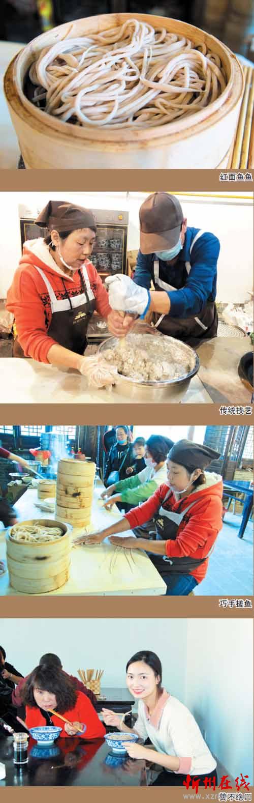 這家店的女主人叫康秀蘭,今年51歲,忻府區(qū)豆羅鎮(zhèn)韓溝村人。秀蘭從小勤快,幫助母親洗鍋做飯,學搓魚魚。18歲時便遠近聞名,掌握了搓魚魚的好手藝。在今年忻州古城招商比賽入圍的6家店鋪中,秀蘭的小店脫穎而出,奪得第一名,拿到了開門店的資格。眼下夫妻二人經(jīng)營著兩間大的門臉兒,小籠屜蒸魚魚,臊子有鮮肉蘑菇、西紅柿和老酸菜湯,食客們可根據(jù)自己的喜好選擇。他們兩口子既當老板又是廚師。在食客多時臨時雇幾個幫工,小生意做得風生水起。康秀蘭告訴筆者,自開張以來食客不斷增加,國慶節(jié)假期期間一天的最高銷售紀錄是賣出200多籠紅面魚魚。