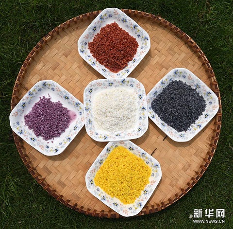 上五圖:4種不同植物及其色素染成的糯米和原色糯米;下左圖:4種不同植物色素染成的糯米和原色糯米;下右圖:在廣西上林縣巷賢鎮(zhèn),兩名壯族村民在查看一桶剛剛蒸熟的五色糯米飯(拼版圖片,3月25日攝)。 每年“壯族三月三”到來之際,廣西的壯族同胞都有蒸制五色糯米飯迎接節(jié)日的習俗,以祈禱五谷豐登,五福臨門。這些五色糯米飯,主要采用天然植物萃取色素,將糯米分別浸泡到紫、黃、紅、黑4種不同植物色素的水里,充分染色后,與原色糯米一起蒸熟而成。色澤鮮艷、清香誘人的五色糯米飯,是“壯族三月三”接待來客時必不可少的傳統(tǒng)美食。新華社記者 陸波岸 攝