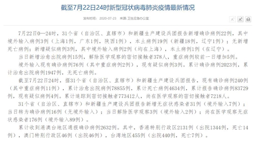 人民網(wǎng)北京7月23日電(董童)國家衛(wèi)生健康委于今日在官網(wǎng)發(fā)布的《截至7月22日24時(shí)新型冠狀病毒肺炎疫情最新情況》(以下簡稱“情況”)提出,7月22日0—24時(shí),31個省(自治區(qū)、直轄市)和新疆生產(chǎn)建設(shè)兵團(tuán)報(bào)告新增確診病例22例,其中境外輸入病例3例(上海1例,廣東1例,陜西1例),本土病例19例(新疆18例,遼寧1例);無新增死亡病例;新增疑似病例3例,其中境外輸入病例2例(均在上海),本土病例1例(在遼寧)。當(dāng)日新增治愈出院病例15例,解除醫(yī)學(xué)觀察的密切接觸者378人,重癥病例較前一日增加5例。