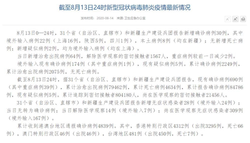 人民網(wǎng)北京8月14日電(董童)國(guó)家衛(wèi)生健康委于今日在官網(wǎng)發(fā)布的《截至8月13日24時(shí)新型冠狀病毒肺炎疫情最新情況》(以下簡(jiǎn)稱(chēng)“情況”)提出,8月13日0—24時(shí),31個(gè)?。ㄗ灾螀^(qū)、直轄市)和新疆生產(chǎn)建設(shè)兵團(tuán)報(bào)告新增確診病例30例,其中境外輸入病例22例(上海16例,陜西5例,四川1例),本土病例8例(均在新疆);無(wú)新增死亡病例;新增疑似病例2例,均為境外輸入病例(均在上海)。當(dāng)日新增治愈出院病例64例,解除醫(yī)學(xué)觀察的密切接觸者1567人,重癥病例較前一日減少2例。
