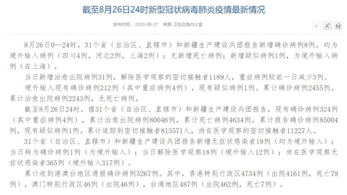 人民網(wǎng)北京8月27日電(董童)國(guó)家衛(wèi)生健康委于今日在官網(wǎng)發(fā)布的《截至8月26日24時(shí)新型冠狀病毒肺炎疫情最新情況》(以下簡(jiǎn)稱“情況”)提出,8月26日0—24時(shí),31個(gè)?。ㄗ灾螀^(qū)、直轄市)和新疆生產(chǎn)建設(shè)兵團(tuán)報(bào)告新增確診病例8例,均為境外輸入病例(四川4例,河北2例,上海2例);無(wú)新增死亡病例;新增疑似病例1例,為境外輸入病例(在上海)。當(dāng)日新增治愈出院病例31例,解除醫(yī)學(xué)觀察的密切接觸者1189人,重癥病例較前一日減少3例。