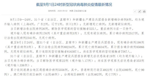 人民網北京9月2日電(董童)國家衛(wèi)生健康委于今日在官網發(fā)布的《截至9月1日24時新型冠狀病毒肺炎疫情最新情況》(以下簡稱“情況”)提出,9月1日0—24時,31個?。ㄗ灾螀^(qū)、直轄市)和新疆生產建設兵團報告新增確診病例8例,均為境外輸入病例(上海4例,廣東2例,遼寧1例,四川1例);無新增死亡病例;無新增疑似病例。當日新增治愈出院病例26例,解除醫(yī)學觀察的密切接觸者525人,重癥病例與前一日持平。