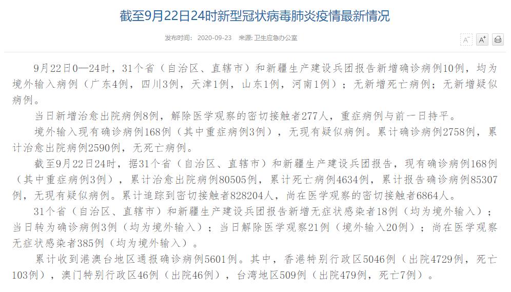 人民網(wǎng)北京9月23日電(董童)國(guó)家衛(wèi)生健康委于今日在官網(wǎng)發(fā)布的《截至9月22日24時(shí)新型冠狀病毒肺炎疫情最新情況》(以下簡(jiǎn)稱“情況”)提出,9月22日0—24時(shí),31個(gè)?。ㄗ灾螀^(qū)、直轄市)和新疆生產(chǎn)建設(shè)兵團(tuán)報(bào)告新增確診病例10例,均為境外輸入病例(廣東4例,四川3例,天津1例,山東1例,河南1例);無(wú)新增死亡病例;無(wú)新增疑似病例。當(dāng)日新增治愈出院病例8例,解除醫(yī)學(xué)觀察的密切接觸者277人,重癥病例與前一日持平。