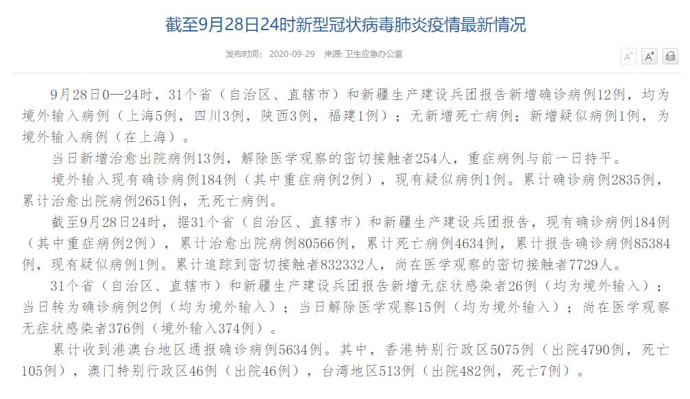 國家衛(wèi)健委:9月28日新增確診病例12例 均為境外輸入病例