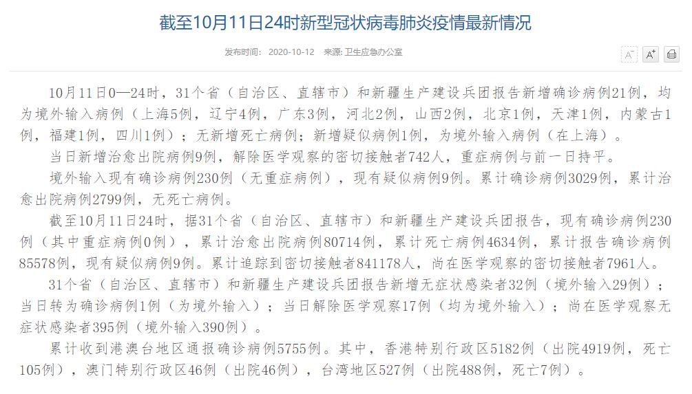 情況顯示,截至10月11日24時,據(jù)31個?。ㄗ灾螀^(qū)、直轄市)和新疆生產(chǎn)建設(shè)兵團報告,現(xiàn)有確診病例230例(其中重癥病例0例),累計治愈出院病例80714例,累計死亡病例4634例,累計報告確診病例85578例,現(xiàn)有疑似病例9例。累計追蹤到密切接觸者841178人,尚在醫(yī)學(xué)觀察的密切接觸者7961人。