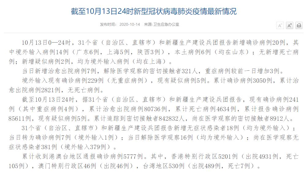 人民網(wǎng)北京10月14日電(董童)國家衛(wèi)生健康委于今日在官網(wǎng)發(fā)布的《截至10月13日24時新型冠狀病毒肺炎疫情最新情況》(以下簡稱“情況”)稱,10月13日0—24時,31個省(自治區(qū)、直轄市)和新疆生產(chǎn)建設兵團報告新增確診病例20例,其中境外輸入病例14例(廣東6例,上海5例,陜西3例),本土病例6例(均在山東);無新增死亡病例;新增疑似病例2例,均為境外輸入病例(均在上海)。當日新增治愈出院病例7例,解除醫(yī)學觀察的密切接觸者321人,重癥病例較前一日增加3例。