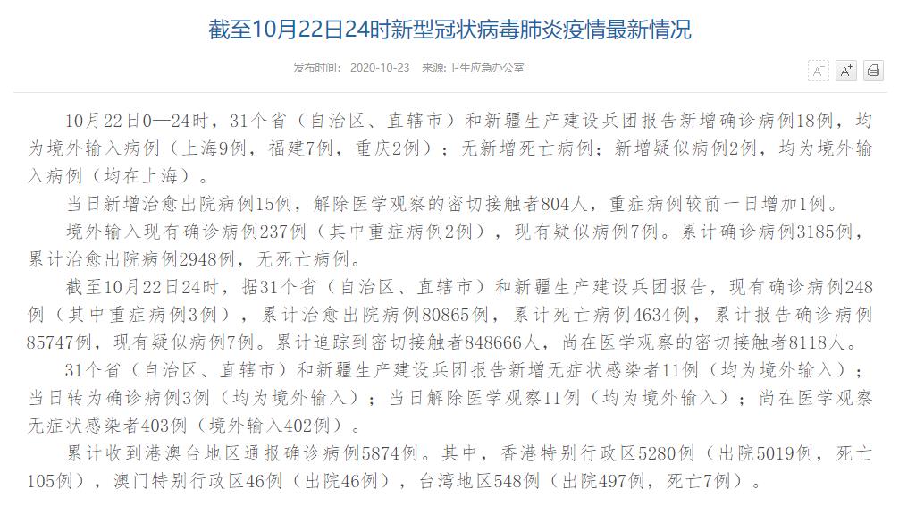 情況顯示,截至10月22日24時(shí),據(jù)31個(gè)?。ㄗ灾螀^(qū)、直轄市)和新疆生產(chǎn)建設(shè)兵團(tuán)報(bào)告,現(xiàn)有確診病例248例(其中重癥病例3例),累計(jì)治愈出院病例80865例,累計(jì)死亡病例4634例,累計(jì)報(bào)告確診病例85747例,現(xiàn)有疑似病例7例。累計(jì)追蹤到密切接觸者848666人,尚在醫(yī)學(xué)觀察的密切接觸者8118人。