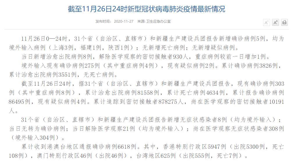 人民網(wǎng)北京11月27日電(董童)國家衛(wèi)生健康委于今日在官網(wǎng)發(fā)布的《截至11月26日24時新型冠狀病毒肺炎疫情最新情況》(以下簡稱“情況”)指出,11月26日0—24時,31個?。ㄗ灾螀^(qū)、直轄市)和新疆生產(chǎn)建設(shè)兵團(tuán)報(bào)告新增確診病例5例,均為境外輸入病例(上海3例,福建1例,陜西1例);無新增死亡病例;無新增疑似病例。當(dāng)日新增治愈出院病例8例,解除醫(yī)學(xué)觀察的密切接觸者930人,重癥病例較前一日增加1例。