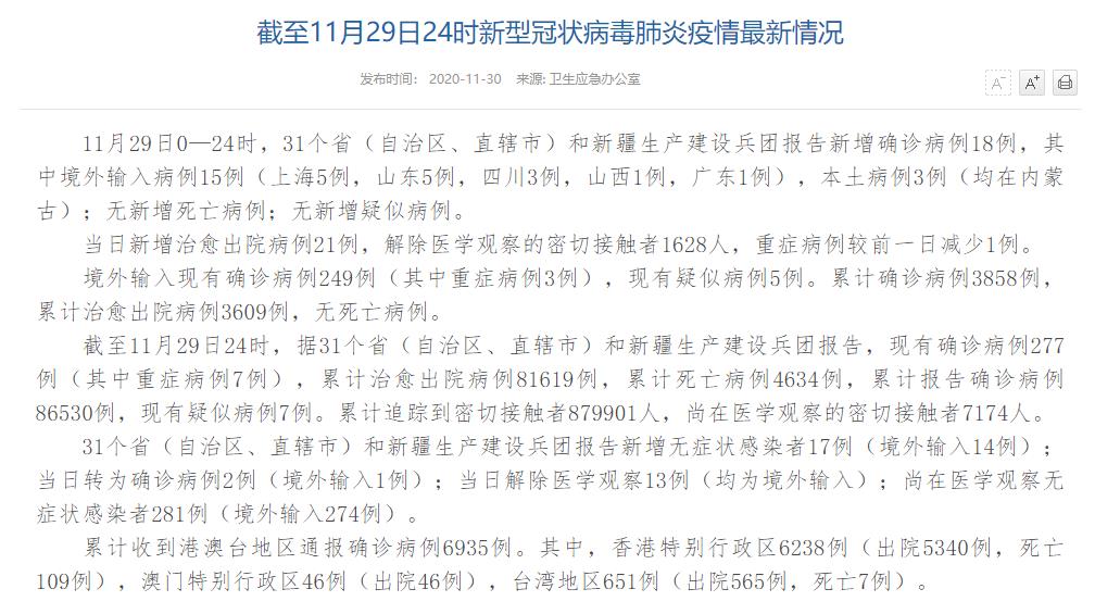 人民網(wǎng)北京11月30日電(董童)國家衛(wèi)生健康委于今日在官網(wǎng)發(fā)布的《截至11月29日24時(shí)新型冠狀病毒肺炎疫情最新情況》(以下簡稱“情況”)指出,11月29日0—24時(shí),31個(gè)省(自治區(qū)、直轄市)和新疆生產(chǎn)建設(shè)兵團(tuán)報(bào)告新增確診病例18例,其中境外輸入病例15例(上海5例,山東5例,四川3例,山西1例,廣東1例),本土病例3例(均在內(nèi)蒙古);無新增死亡病例;無新增疑似病例。當(dāng)日新增治愈出院病例21例,解除醫(yī)學(xué)觀察的密切接觸者1628人,重癥病例較前一日減少1例。