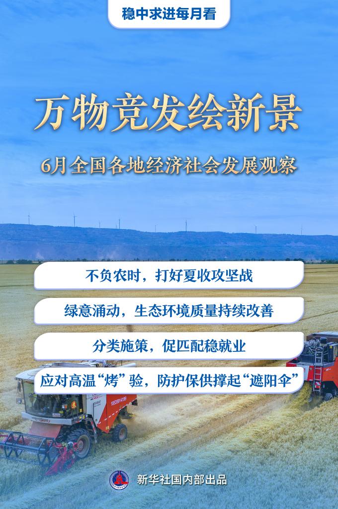 6月仲夏,萬(wàn)物豐茂。廣袤農(nóng)田上,“三夏”生產(chǎn)進(jìn)入關(guān)鍵階段;綠水青山間,低碳發(fā)展不斷繪就新圖景;全力穩(wěn)就業(yè),政府、企業(yè)與高校同頻共振;高溫“烤”驗(yàn)下,做好各項(xiàng)保障工作……上半年收官之月,各地各部門統(tǒng)籌推進(jìn)穩(wěn)增長(zhǎng)、促改革、惠民生舉措,推動(dòng)經(jīng)濟(jì)社會(huì)沿著高質(zhì)量發(fā)展之路穩(wěn)步前行。