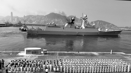 儀式結(jié)束后,湛江艦、運城艦響起清脆的海軍笛,官兵們在舷邊分區(qū)列隊,向碼頭上的人群揮手致意,兩艘艦艇駛離昂船洲軍營碼頭,前往預(yù)定海域與山東艦、延安艦會合。香港特區(qū)直升機、船隊一路引航伴航,護送編隊駛出區(qū)界。