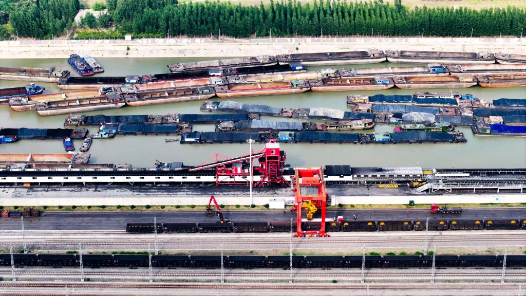 6月8日,在濟(jì)寧港航梁山港,船舶??康却b運(yùn)煤炭(無(wú)人機(jī)照片)。新華社記者郭緒雷 攝