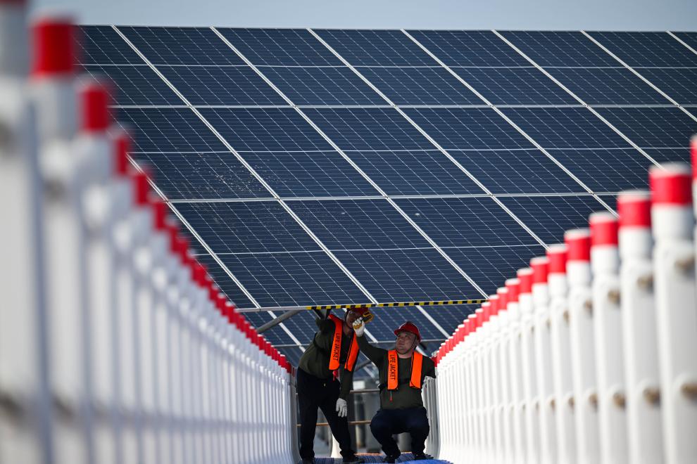 7月10日,在國(guó)家能源集團(tuán)天津龍?jiān)葱履茉从邢薰静郴夥娬荆ぷ魅藛T在檢查光伏發(fā)電板。新華社記者趙子碩 攝
