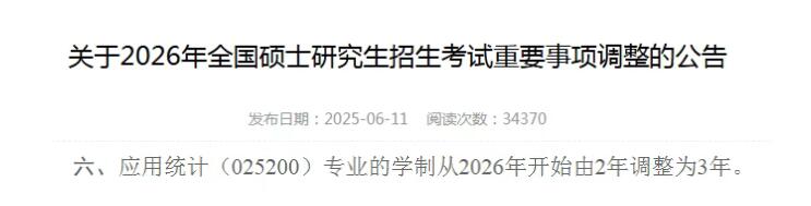 6月11日,中央民族大學(xué)發(fā)布《關(guān)于2026年全國碩士研究生招生考試重要事項(xiàng)調(diào)整的公告》,明確規(guī)定:應(yīng)用統(tǒng)計(jì)(025200)專業(yè)的學(xué)制從2026年開始由2年調(diào)整為3年。