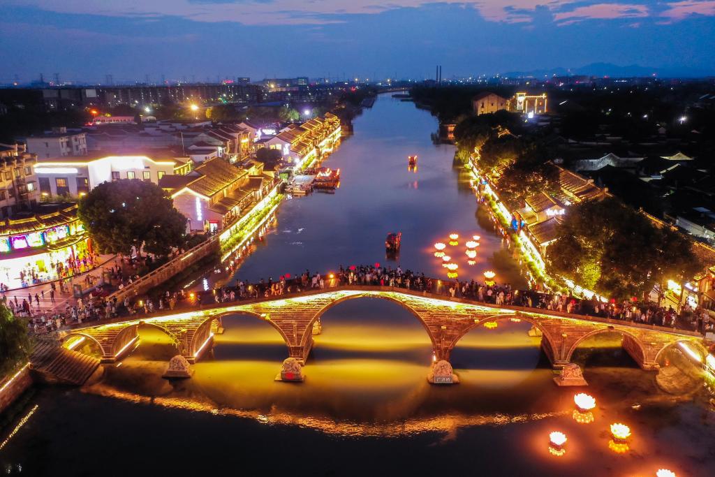10月2日,游客在塘棲古鎮(zhèn)的廣濟(jì)橋觀(guān)賞運(yùn)河夜景(無(wú)人機(jī)照片)。新華社記者 徐昱 攝
