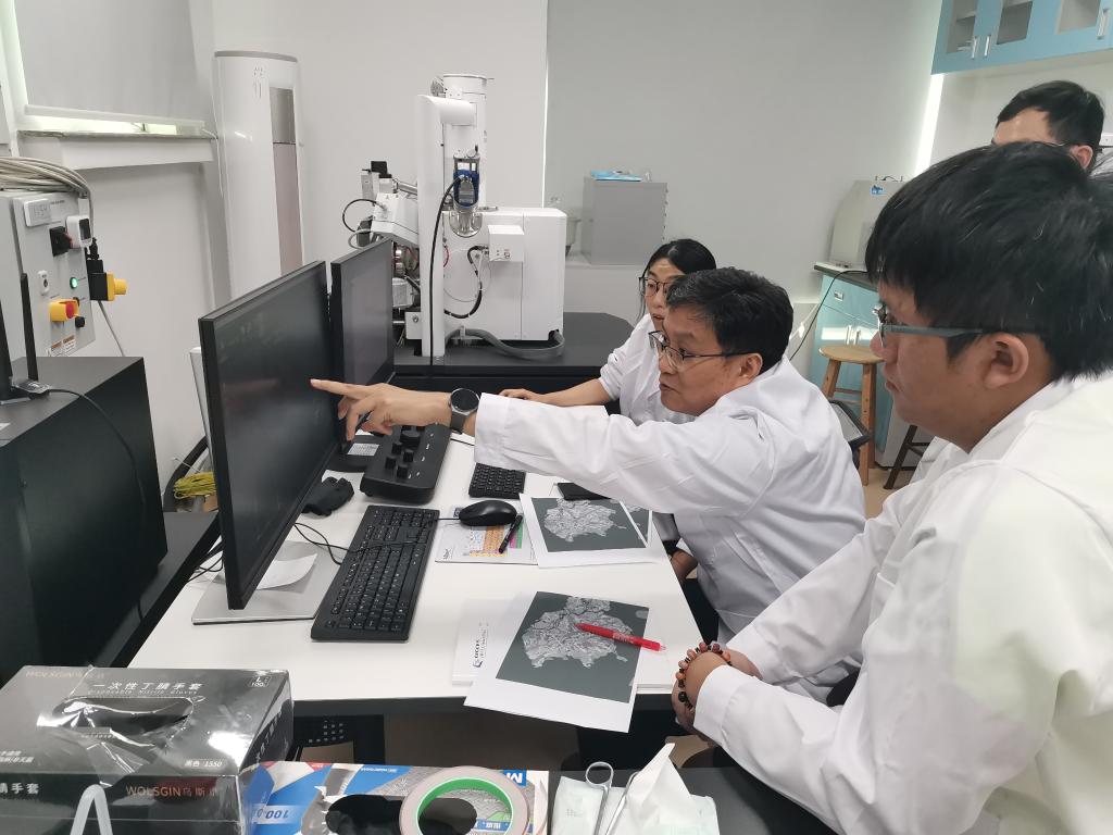 2024年8月26日,徐義剛院士與團(tuán)隊(duì)成員通過掃描電鏡觀察嫦娥六號(hào)樣品特征。(中國科學(xué)院廣州地球化學(xué)研究所供圖)