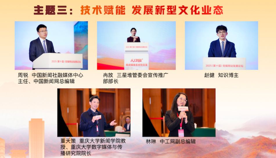 在“技術(shù)賦能 發(fā)展新型文化業(yè)態(tài)”主題研討環(huán)節(jié),中國新聞社融媒體中心主任、中國新聞網(wǎng)總編輯周銳,三星堆管委會宣傳推廣部部長冉放,知識博主趙健,分別就技術(shù)賦能中華文化“破圈”出海、三星堆文化傳播數(shù)智實踐、短視頻文化傳播等方面的經(jīng)驗成果進行了精彩展示。重慶大學(xué)新聞學(xué)院教授、重慶大學(xué)數(shù)字媒體與傳播研究院院長董天策,中工網(wǎng)副總編輯林琳作為互動嘉賓進行了點評,期待主流媒體發(fā)揮傳播實踐智慧,在內(nèi)容、技術(shù)和社會責任之間找到平衡,鑄造中華文化新輝煌。