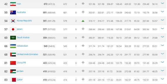 亞洲排名1-7的球隊也沒有變化,依次是伊朗、澳大利亞、韓國、日本、沙特、烏茲別克斯坦、阿聯(lián)酋。國足12強賽同組的另外兩個對手排名也沒有發(fā)生變化,卡塔爾排名第83,落后國足兩位,亞洲排名第10;而敘利亞依然排名世界第110、亞洲第14。