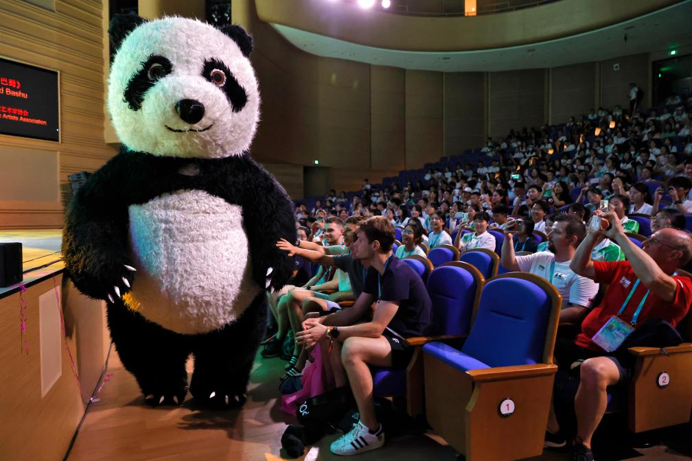 8月2日,一名演員裝扮成大熊貓在演出間隙與觀眾互動。當日,“奇幻之夜”雜技魔術(shù)晚會在成都大運村藝術(shù)中心大劇場舉行。本場活動是在大運村舉辦的“Be Together”主題系列晚會之一。新華社記者沈伯韓攝