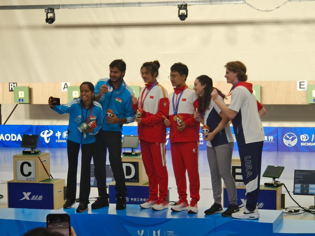 當天,射擊賽場的頒獎儀式現(xiàn)場變成了全場一起慶生的歡樂景象。在10米氣步槍混合團體項目獲得銀牌的印度姑娘瓦拉里萬站在領(lǐng)獎臺上,在“生日快樂”的祝福聲中,伴著現(xiàn)場觀眾的掌聲,與一同參加頒獎儀式的中國、美國選手們拍照留念。