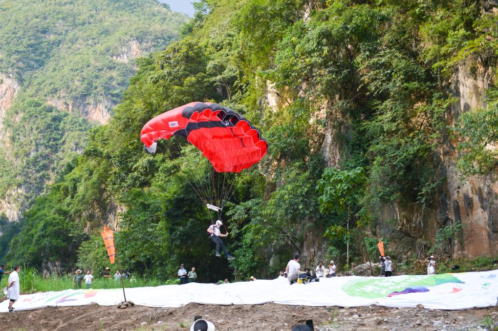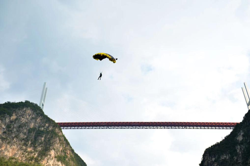 新華社貴陽9月6日電(記者駱飛、吳思)6日上午,極限運動員們相繼從北盤江大橋上飛躍而下,拉開了在貴州省六盤水市舉行的2023國際高橋極限運動邀請賽世界第一高橋站低空跳傘角逐的序幕。
