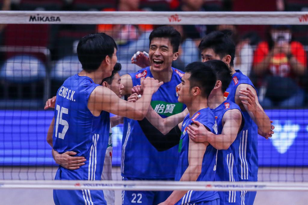 7月9日,中國隊(duì)球員在比賽中慶祝得分。當(dāng)日,在菲律賓帕賽舉行的2023年世界男排聯(lián)賽菲律賓站比賽中,中國隊(duì)以1:3不敵加拿大隊(duì)。新華社發(fā)(烏馬利攝)