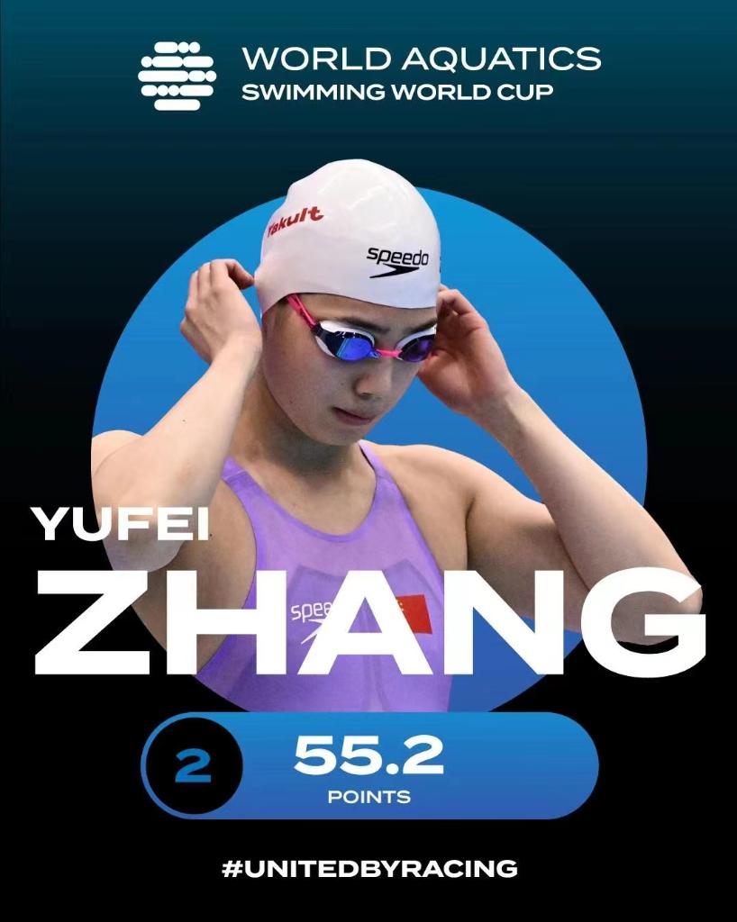 何詩(shī)蓓則以52秒02的成績(jī)改寫(xiě)她9月底在杭州亞運(yùn)會(huì)創(chuàng)造的女子100米自由泳亞洲紀(jì)錄52秒17,成為該項(xiàng)目歷史上第三快的選手,她還收獲了200米自由泳金牌和400米自由泳銅牌,在積分榜列第三名。