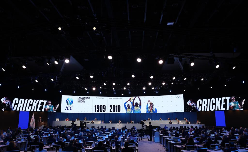 這是10月16日在印度孟買(mǎi)舉行的國(guó)際奧委會(huì)第141次全會(huì)現(xiàn)場(chǎng)大屏幕展示的板球項(xiàng)目。新華社記者 曹燦 攝