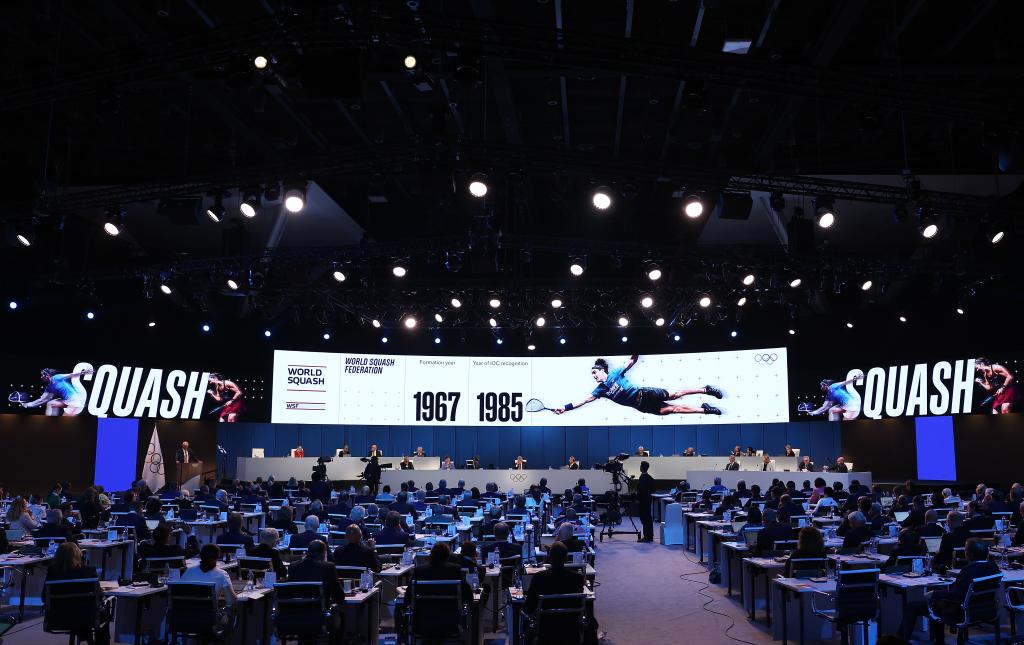 這是10月16日在印度孟買(mǎi)舉行的國(guó)際奧委會(huì)第141次全會(huì)現(xiàn)場(chǎng)大屏幕展示的壁球項(xiàng)目。新華社記者 曹燦 攝