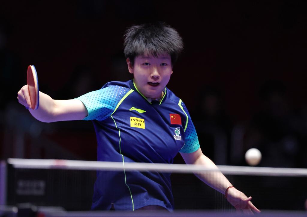 2月19日,中國(guó)隊(duì)孫穎莎在第二盤比賽中回球。新華社記者 楊世堯 攝