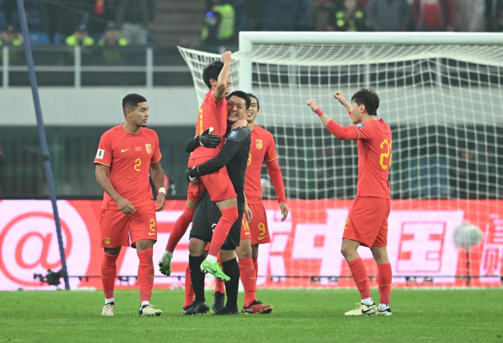 3月26日,中國隊(duì)守門員王大雷(左三)與中國隊(duì)球員韋世豪(左二)慶祝得分。新華社記者 孫凡越 攝