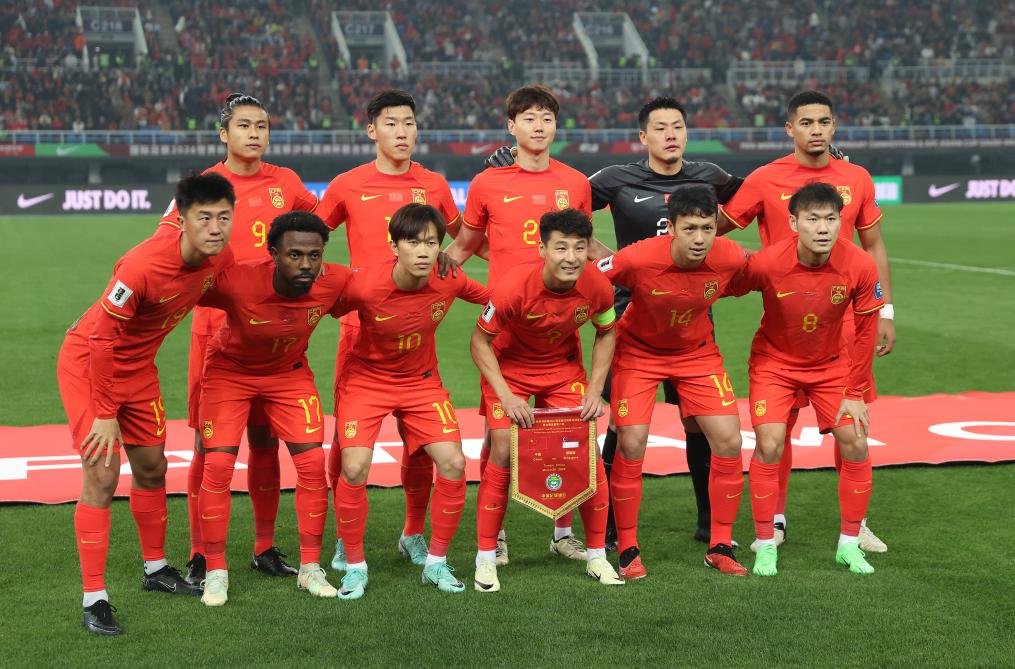 3月26日,中國隊(duì)首發(fā)球員在比賽前合影。新華社記者 賈浩成 攝