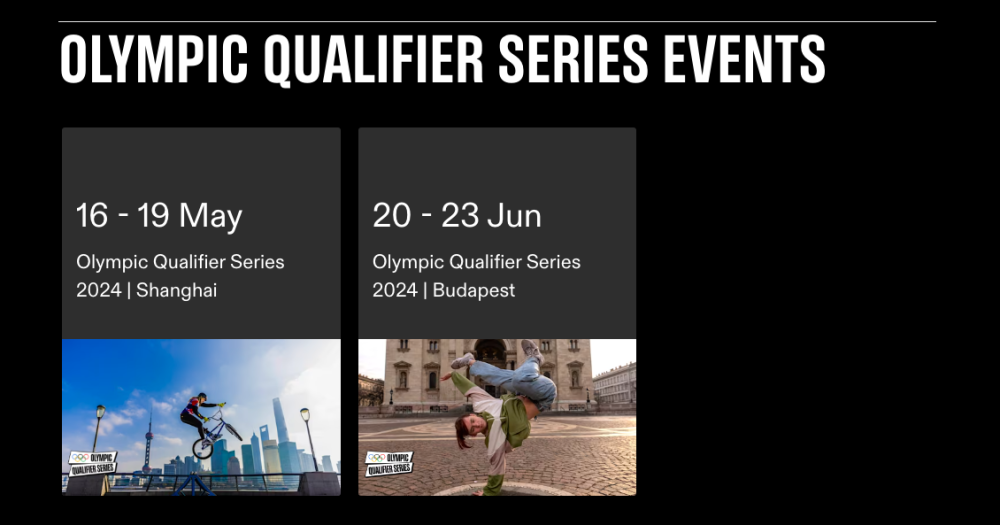 中國上海和匈牙利布達佩斯被選為這一全新賽事的舉辦城市,其中上海站將于2024年5月16日至19日舉辦,布達佩斯站將于6月20日至23日舉辦,包括自由式小輪車、霹靂舞、滑板和攀巖四個項目的奧運資格賽。