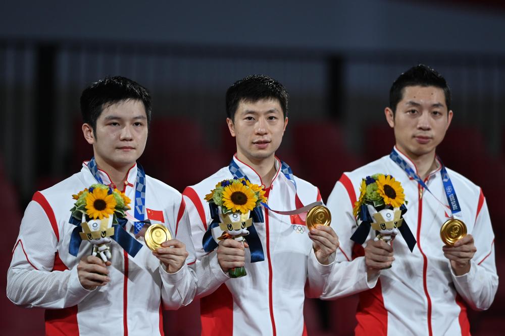 2021年8月6日,中國隊選手馬龍(中)、許昕(右)、樊振東在頒獎儀式上。當日,在東京奧運會乒乓球男子團體決賽中,中國隊以3:0的總比分戰(zhàn)勝德國隊,奪得冠軍。新華社記者 黃宗治 攝