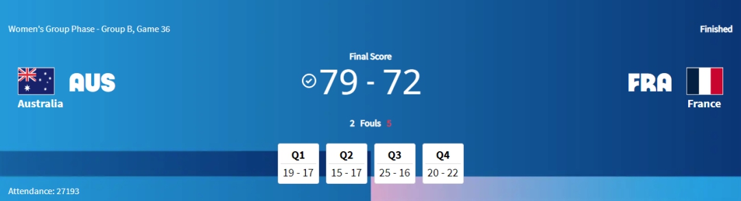 中新網(wǎng)北京8月5日電(記者 劉星晨)北京時(shí)間5日凌晨,巴黎奧運(yùn)會(huì)女籃小組賽全部結(jié)束。在最后一場比賽中,澳大利亞女籃79:72戰(zhàn)勝東道主法國女籃。本場取勝后,澳大利亞女籃以2勝1負(fù)的戰(zhàn)績出線。 由于中國女籃在所有小組第3中成績靠后,因此遺憾無緣八強(qiáng)。