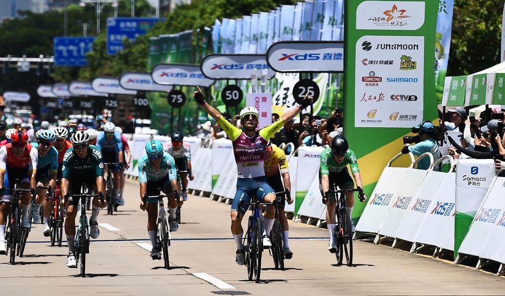 8月27日,意大利克羅蒂克車隊(duì)車手馬雷奇科(前)率先沖線后慶祝。新華社記者 楊冠宇 攝 作為當(dāng)日的沖刺王,這名意大利車手還贏得了綠衫。西班牙科恩制藥車隊(duì)的安吉爾和飛銳快客洲際車隊(duì)的馬丁分列賽段二、三位。 環(huán)島賽第一賽段設(shè)在瓊海,車手上午10點(diǎn)從市政廣場出發(fā),途經(jīng)博鰲亞洲論壇永久會址、潭門漁業(yè)小鎮(zhèn)、南海博物館等知名地標(biāo),全程95.6公里。 中國車手在本賽段表現(xiàn)不俗。巴迪瑞洲際車隊(duì)的王奎程摘得象征亞洲最佳車手的藍(lán)衫,五指山1867車隊(duì)的薛超華以爬山王身份穿上圓點(diǎn)衫,同隊(duì)的于澤獲得“敢斗獎”。