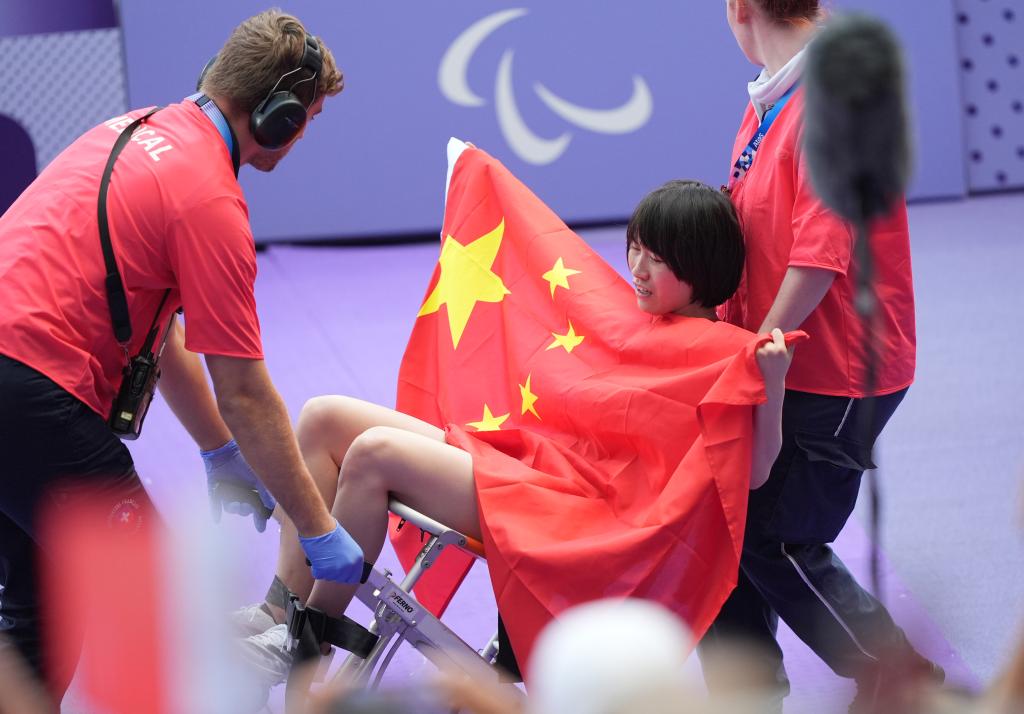 9月1日,中國選手史逸婷賽后在醫(yī)護(hù)人員的幫助下離場。新華社記者 才揚(yáng) 攝 超越自己沒有終點(diǎn)。 34歲的代云強(qiáng)在最后一百米反超對手,終于拿到了男子400米T54級(jí)金牌。“訓(xùn)練里很多時(shí)候都把自己練吐。”代云強(qiáng)說,“特別苦特別累的時(shí)候教練和隊(duì)友們都在加油鼓勁?!?/p> 對很多中國選手來說,對手只有自己。張亮敏已經(jīng)38歲了,在巴黎,她沒能在女子鐵餅F11級(jí)決賽中打破自己保持的世界紀(jì)錄,這驅(qū)使她向著個(gè)人第七屆殘奧會(huì)前進(jìn)。她充滿自信地說:“我平時(shí)的成績很多都超過世界紀(jì)錄,我會(huì)繼續(xù)為國爭光。”